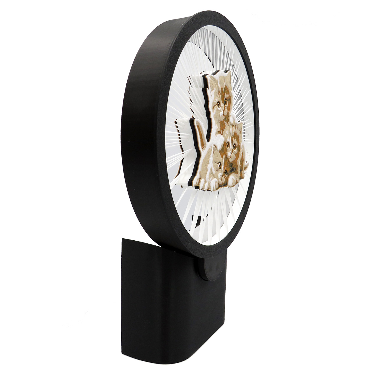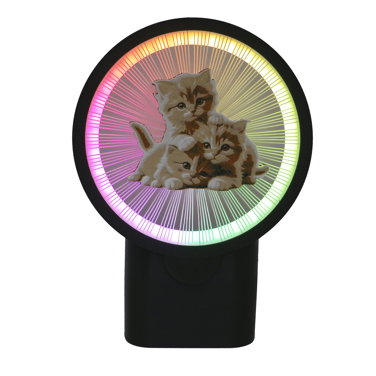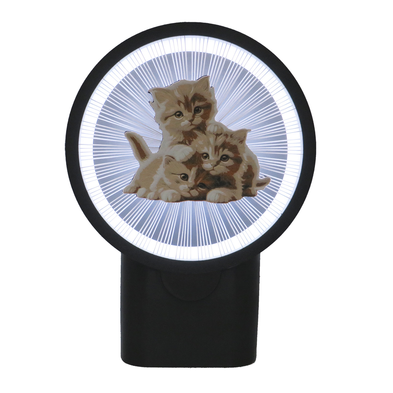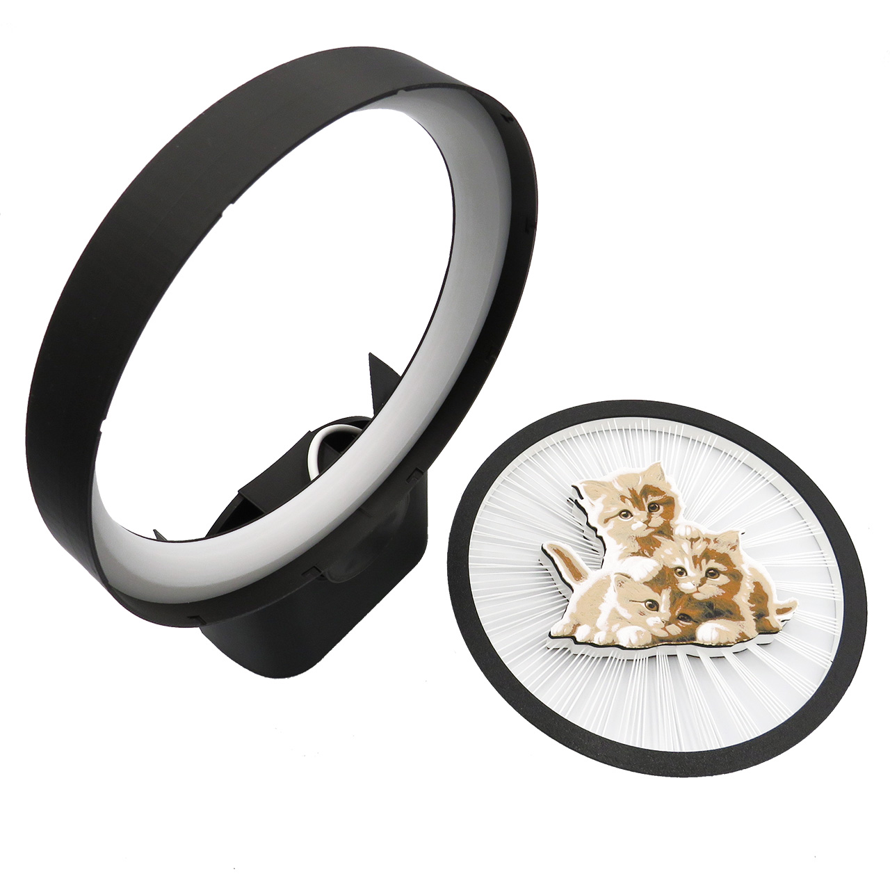 Sieninis šviestuvas kačiukai, LED, tvirtinamas prie sienos su keičiamomis dekoracijomis. Šis apskritimo formos šviestuvas su LED juosta turi spalvotą piešinį sukurtą iš kelių plastiko spalvų – 3 žaidžiančius kačiukus kuris tarsi sklendžia ore palaikomas plastiko gijų (dekoracijoje iš viso yra 150 plastiko gijų, o 1 gijos storis yra mažesnis nei 1mm). Piešinys yra abiejose pusėse.