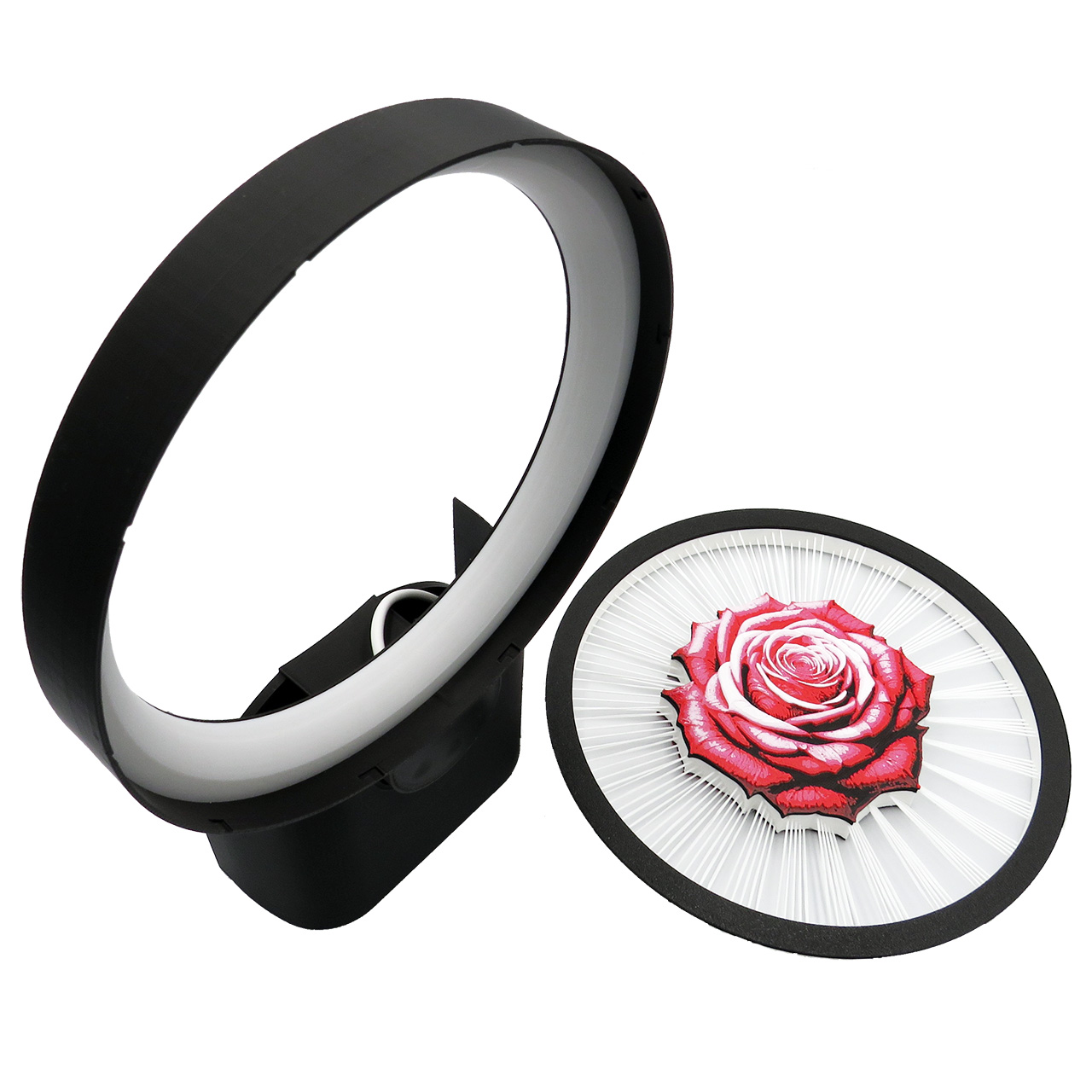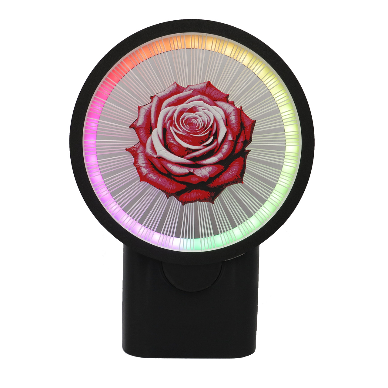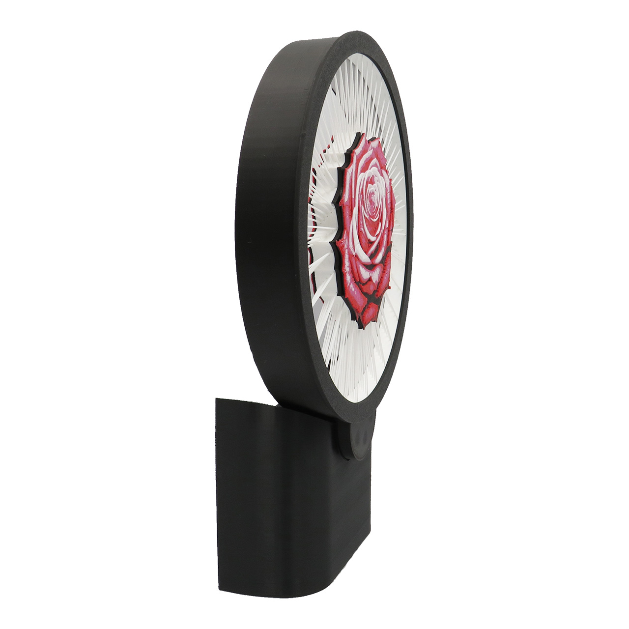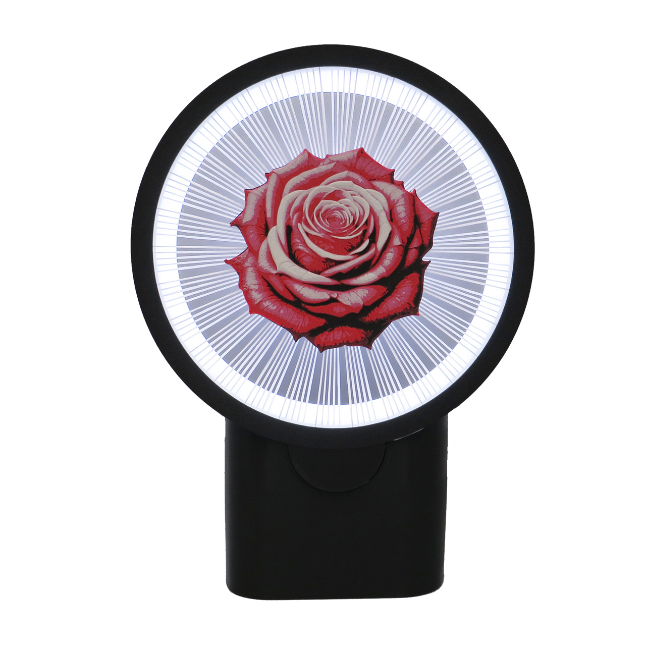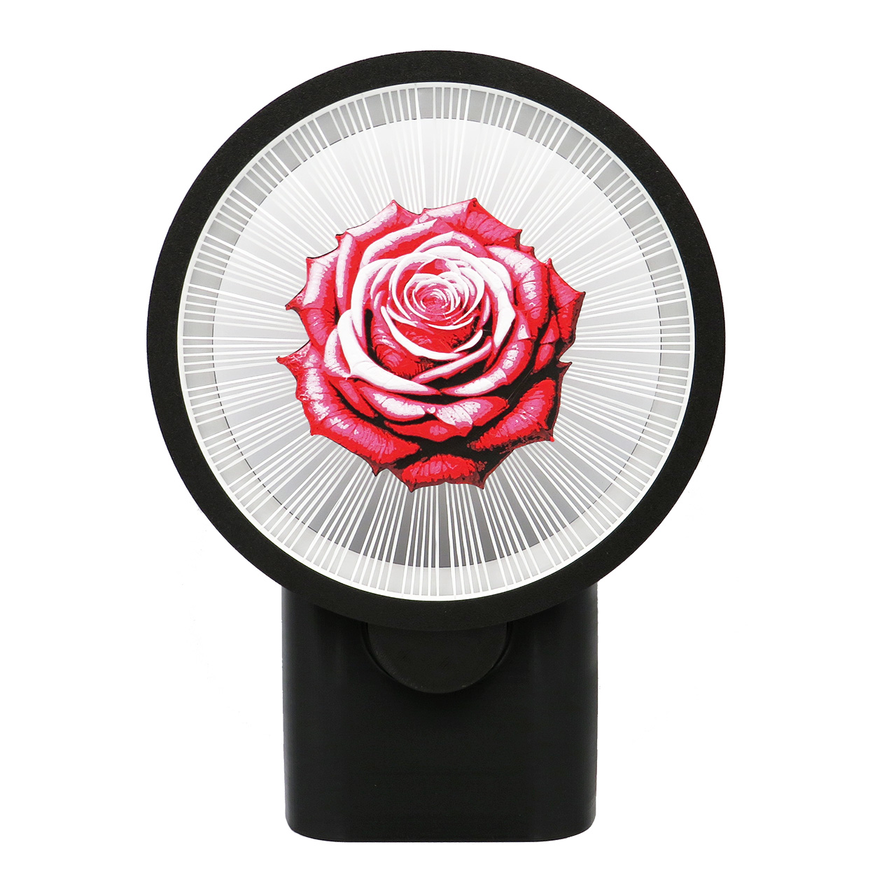 Sieninis šviestuvas rožė, LED, tvirtinamas prie sienos su keičiamomis dekoracijomis. Šis apskritimo formos šviestuvas su LED juosta turi spalvotą piešinį sukurtą iš kelių plastiko spalvų – rožės žiedą kuris tarsi sklendžia ore palaikomas plastiko gijų (dekoracijoje iš viso yra 150 plastiko gijų, o 1 gijos storis yra mažesnis nei 1mm). Piešinys yra abiejose pusėse.