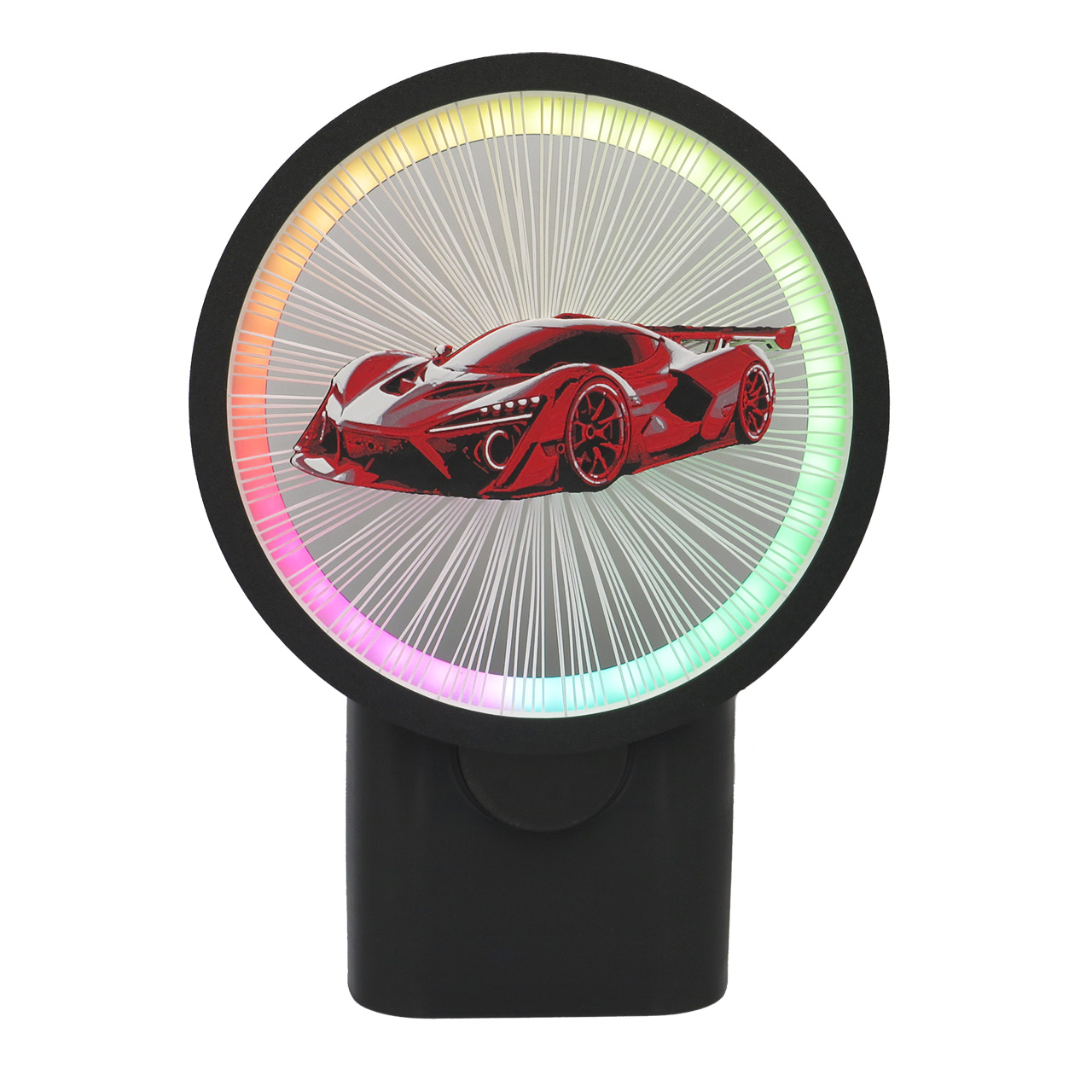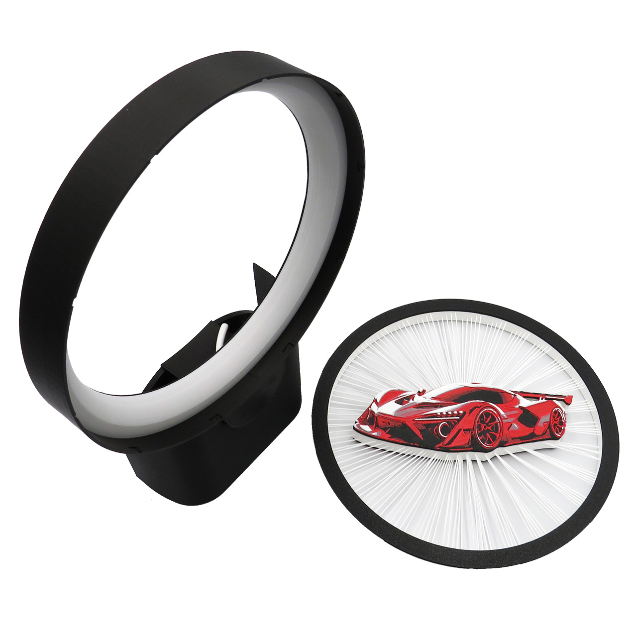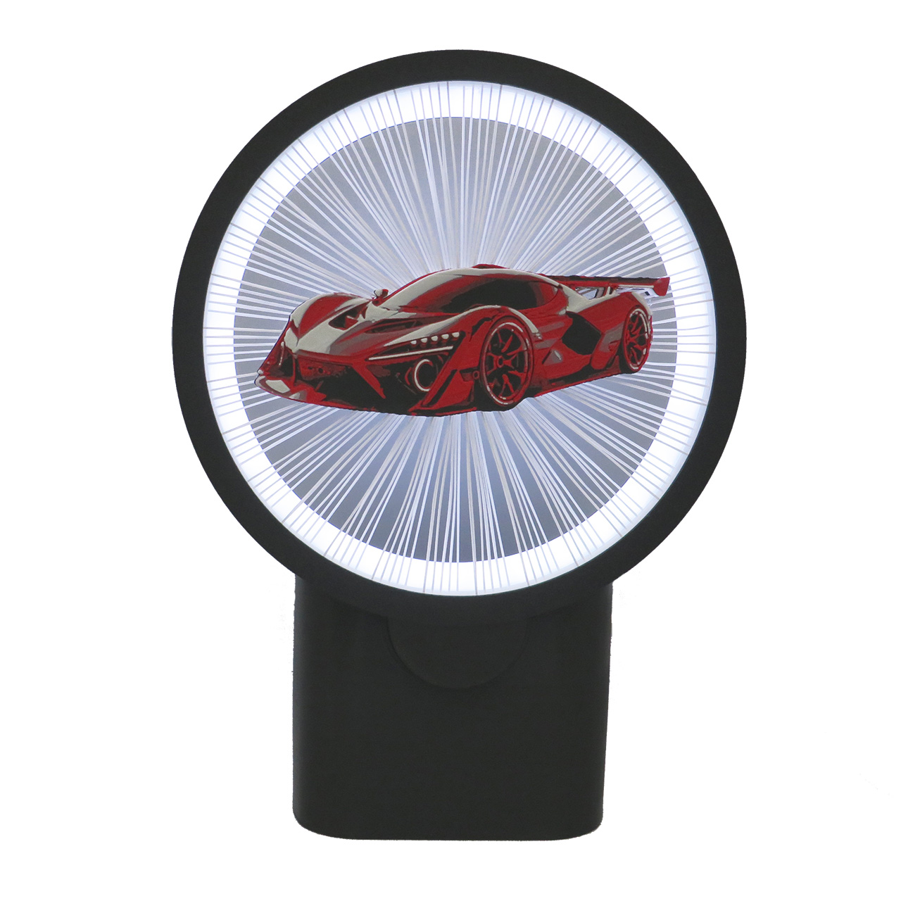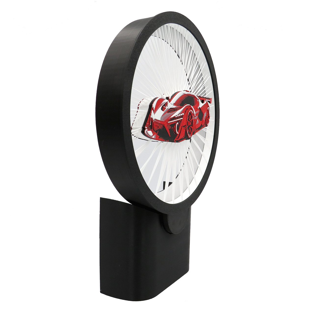 Sieninis šviestuvas sportinis automobilis, LED, tvirtinamas prie sienos su keičiamomis dekoracijomis. Šis apskritimo formos šviestuvas su LED juosta turi spalvotą piešinį sukurtą iš kelių plastiko spalvų – sportinį automobilį kuris tarsi sklendžia ore palaikomas plastiko gijų (dekoracijoje iš viso yra 150 plastiko gijų, o 1 gijos storis yra mažesnis nei 1mm). Piešinys yra abiejose pusėse.