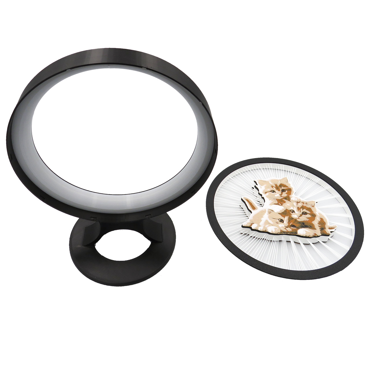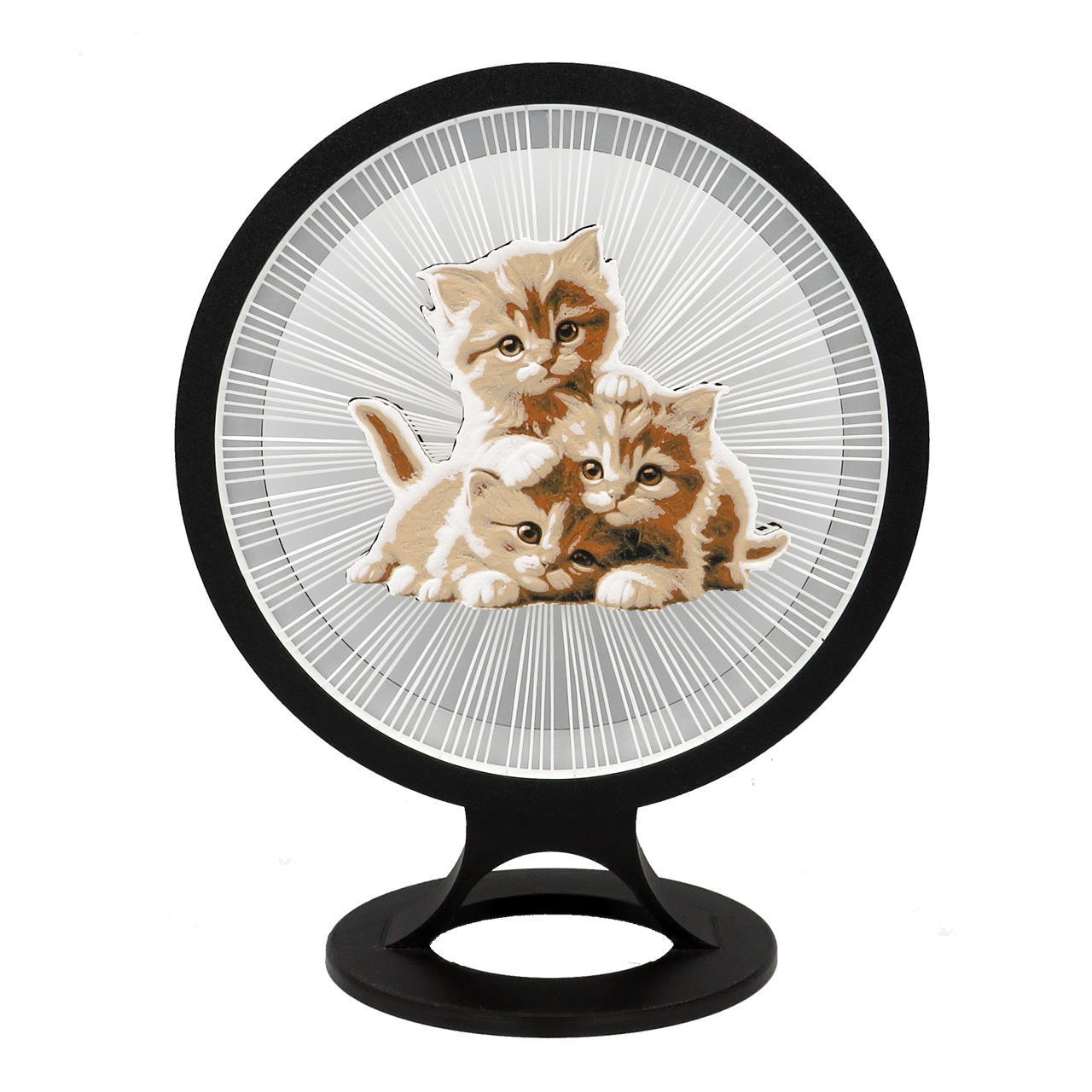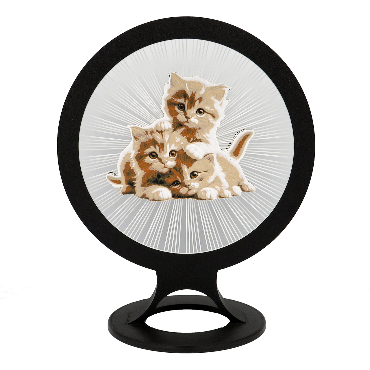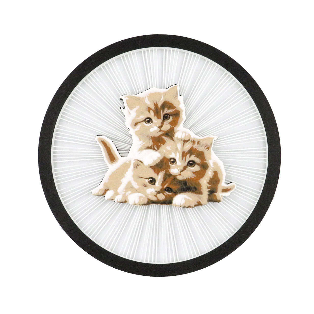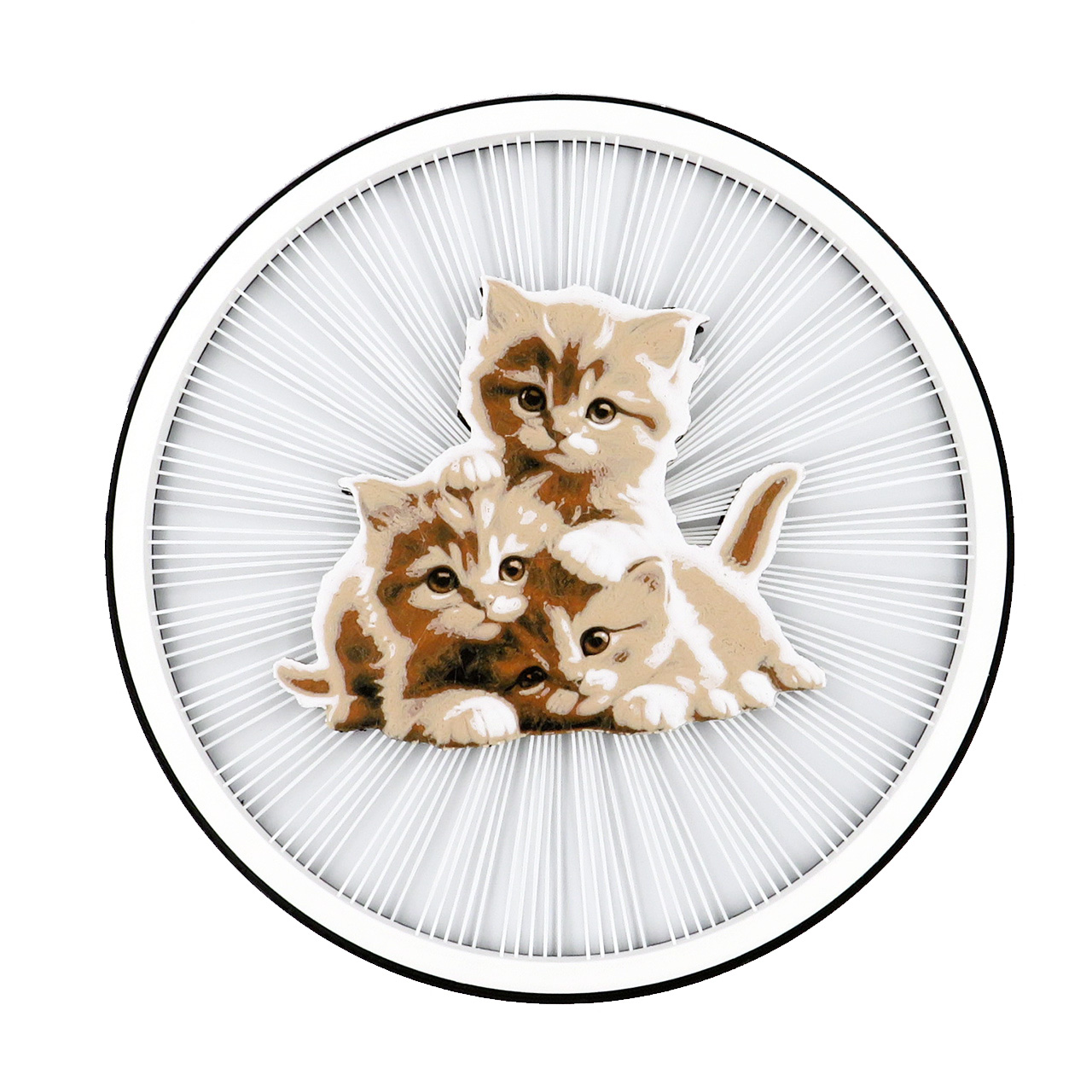 Stalinė dekoracija kačiukai, pastatoma su keičiamomis dekoracijomis. Ši apskritimo formos dekoracija turi spalvotą piešinį sukurtą iš kelių plastiko spalvų – 3 žaidžiančius kačiukus, kuris tarsi sklendžia ore palaikomas plastiko gijų (dekoracijoje iš viso yra 150 plastiko gijų, o 1 gijos storis yra mažesnis nei 1mm). Piešinys yra abiejose pusėse, todėl šią dekoraciją galima naudoti iš dviejų pusių.
