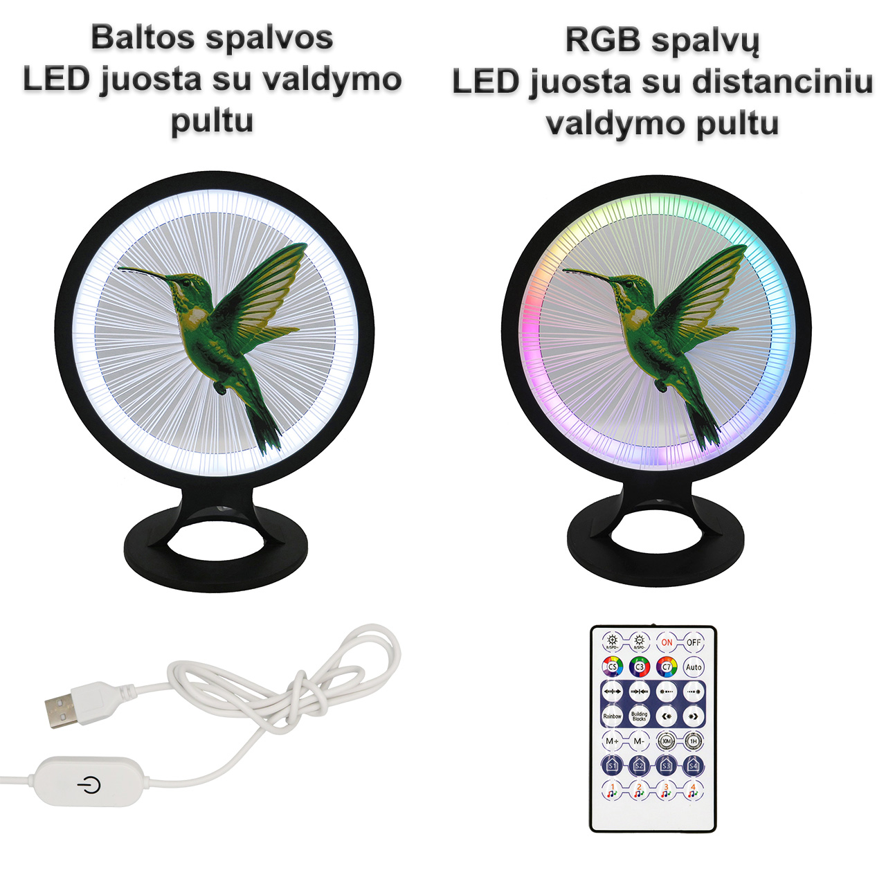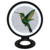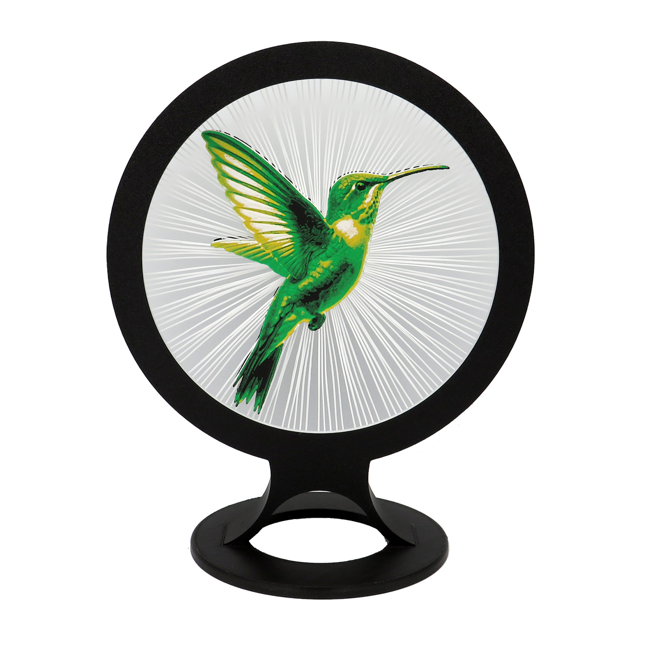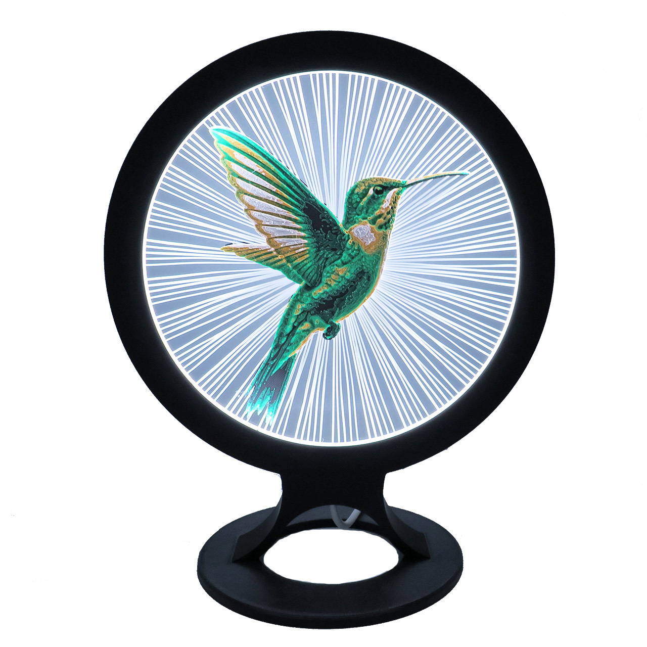 Stalinis šviestuvas Kolibris, LED, pastatomas su keičiamomis dekoracijomis. Šis apskritimo formos šviestuvas su LED juosta turi spalvotą piešinį sukurtą iš kelių plastiko spalvų – paukštį Kolibrį kuris tarsi sklendžia ore palaikomas plastiko gijų (dekoracijoje iš viso yra 150 plastiko gijų, o 1 gijos storis yra mažesnis nei 1mm). Piešinys yra abiejose pusėse, todėl šį šviestuvą galima naudoti iš dviejų pusių. Šis šviestuvas yra naktinis ir skaitymui netinka.