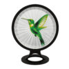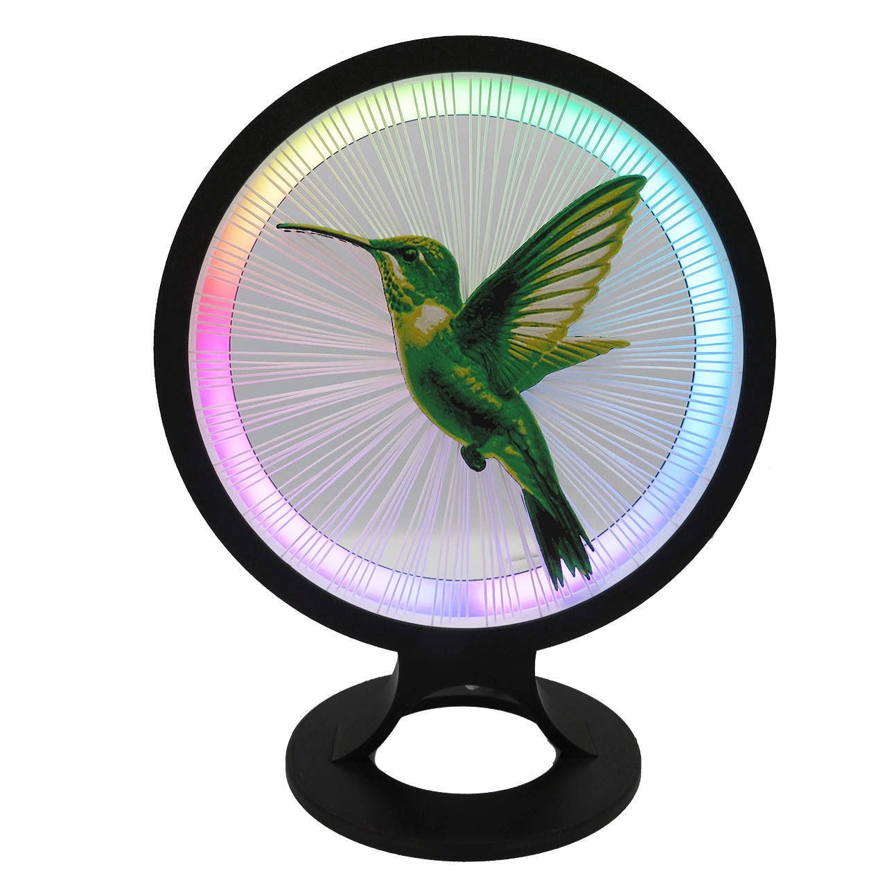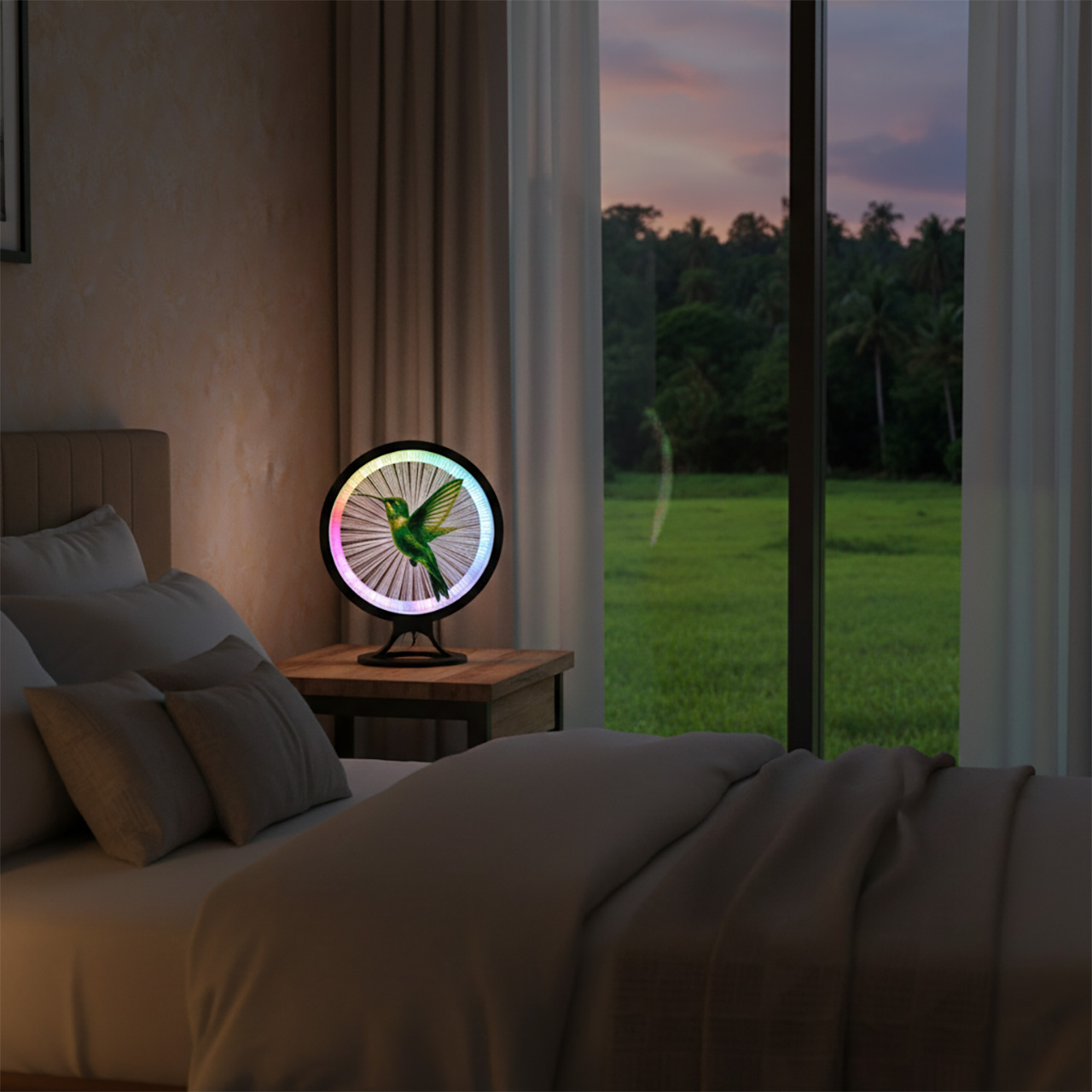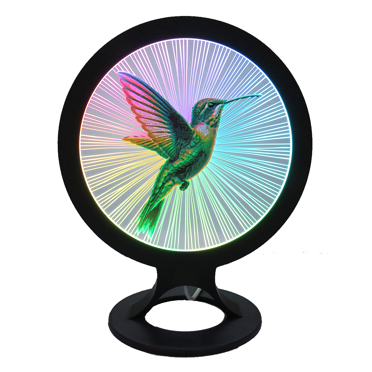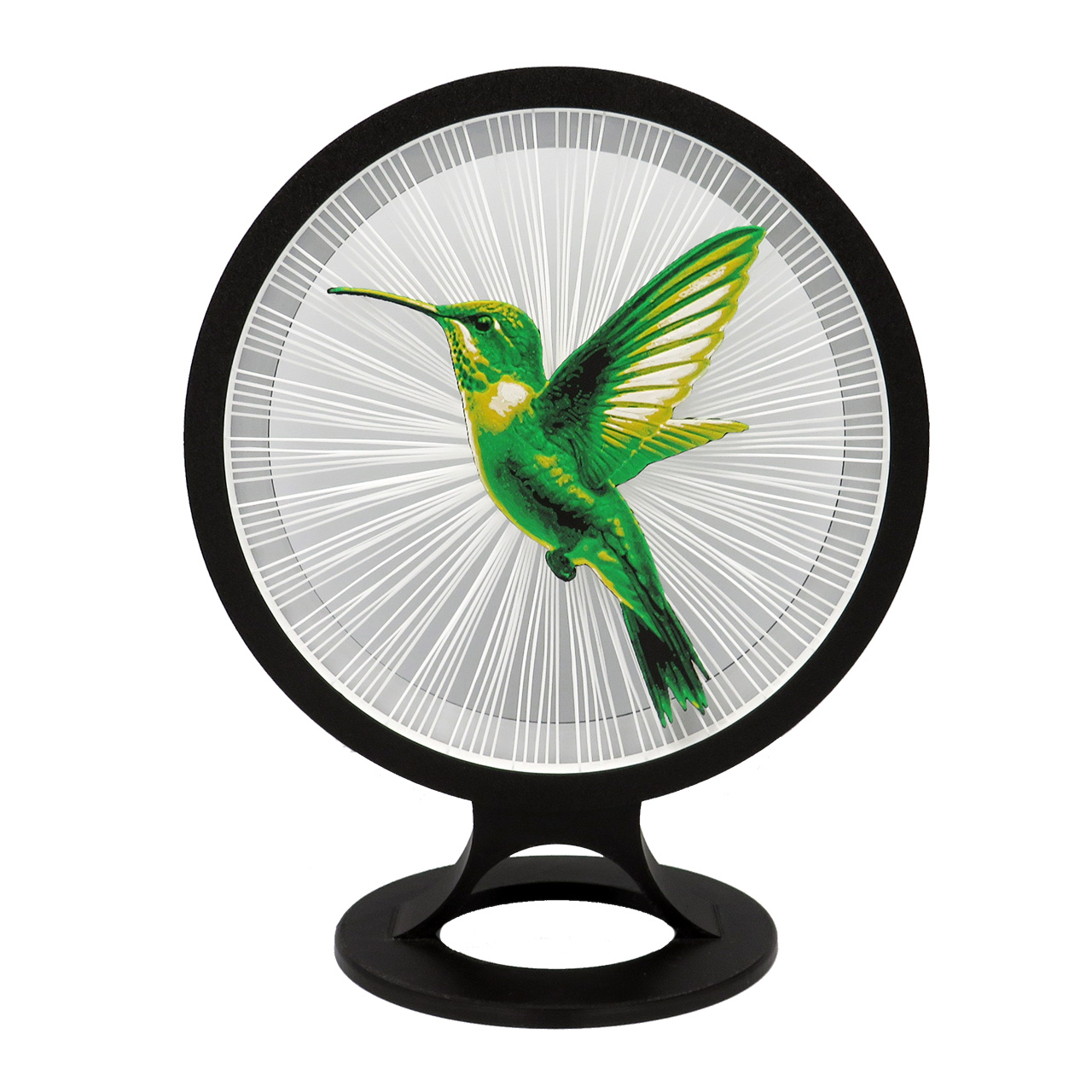 Stalinis šviestuvas Kolibris, LED, pastatomas su keičiamomis dekoracijomis. Šis apskritimo formos šviestuvas su LED juosta turi spalvotą piešinį sukurtą iš kelių plastiko spalvų – paukštį Kolibrį kuris tarsi sklendžia ore palaikomas plastiko gijų (dekoracijoje iš viso yra 150 plastiko gijų, o 1 gijos storis yra mažesnis nei 1mm). Piešinys yra abiejose pusėse, todėl šį šviestuvą galima naudoti iš dviejų pusių. Šis šviestuvas yra naktinis ir skaitymui netinka.