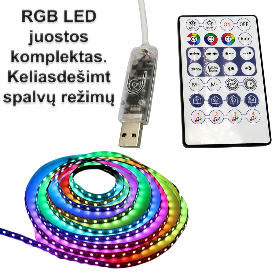 2. Spalvotos RGB LED juostos kiekviena lemputė gali šviesti kita spalva nei šalia esanti, tai reiškia kad šviestuvas vienu metu gali šviesti daugeliu skirtingų spalvų, o jungiklis gali išjungti/įjungti šviestuvą, reguliuoti švietimo intensyvumą, turi keliasdešimt spalvų režimų. Jungiklį galima valdyti distanciniu pultu ir/arba telefonu per programėlę.