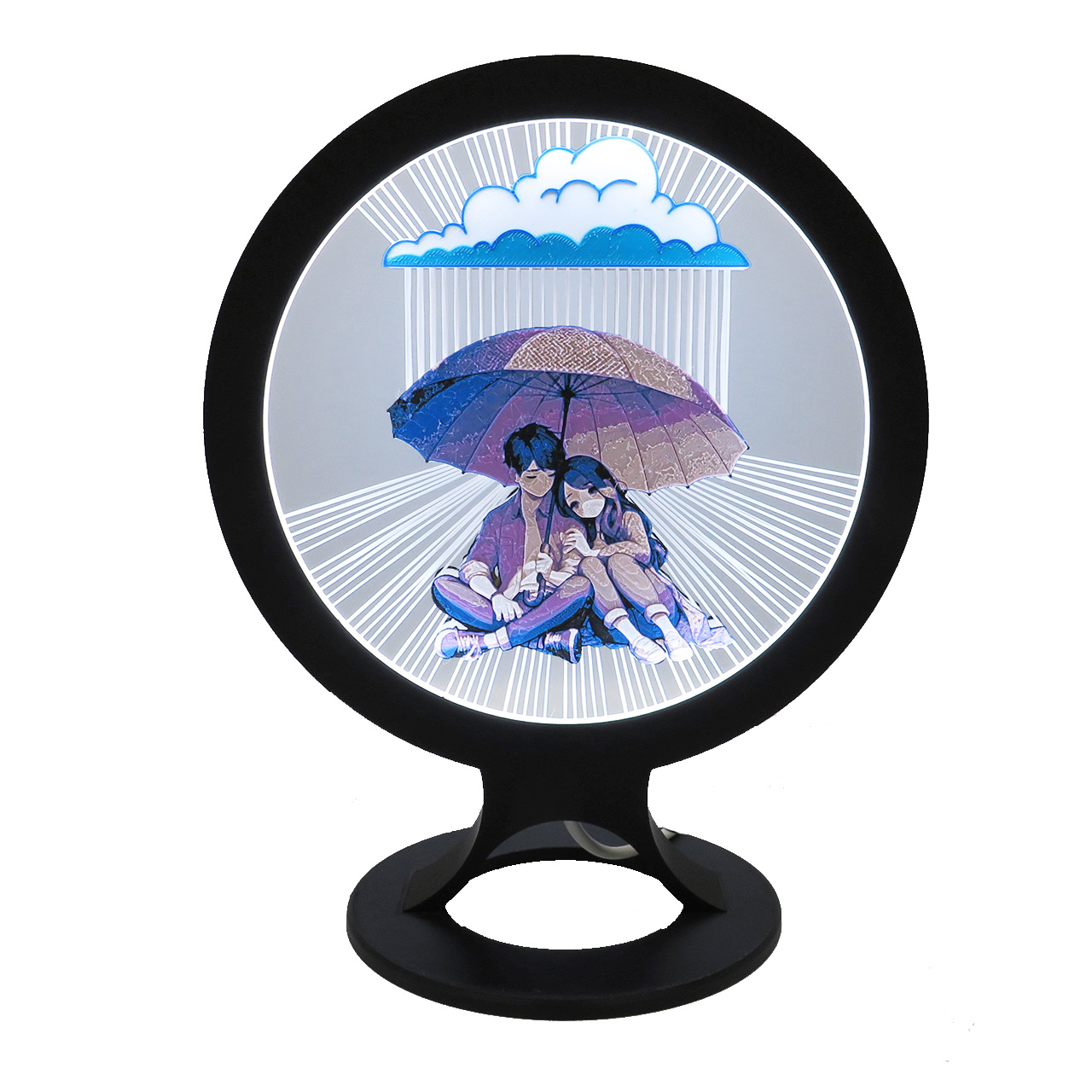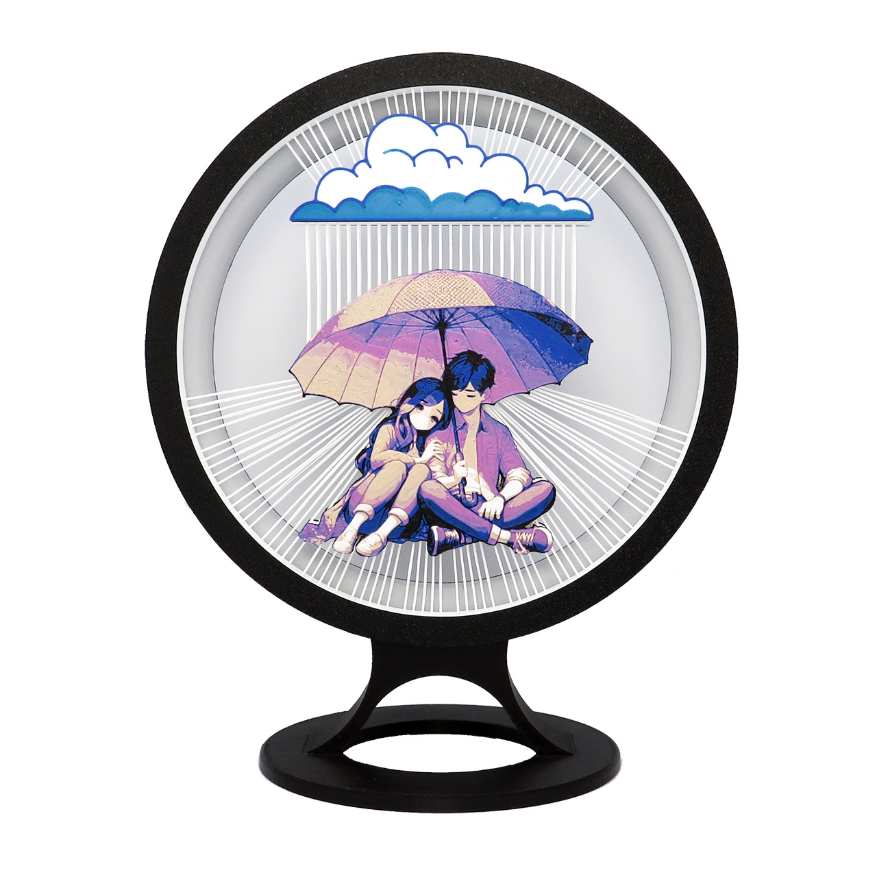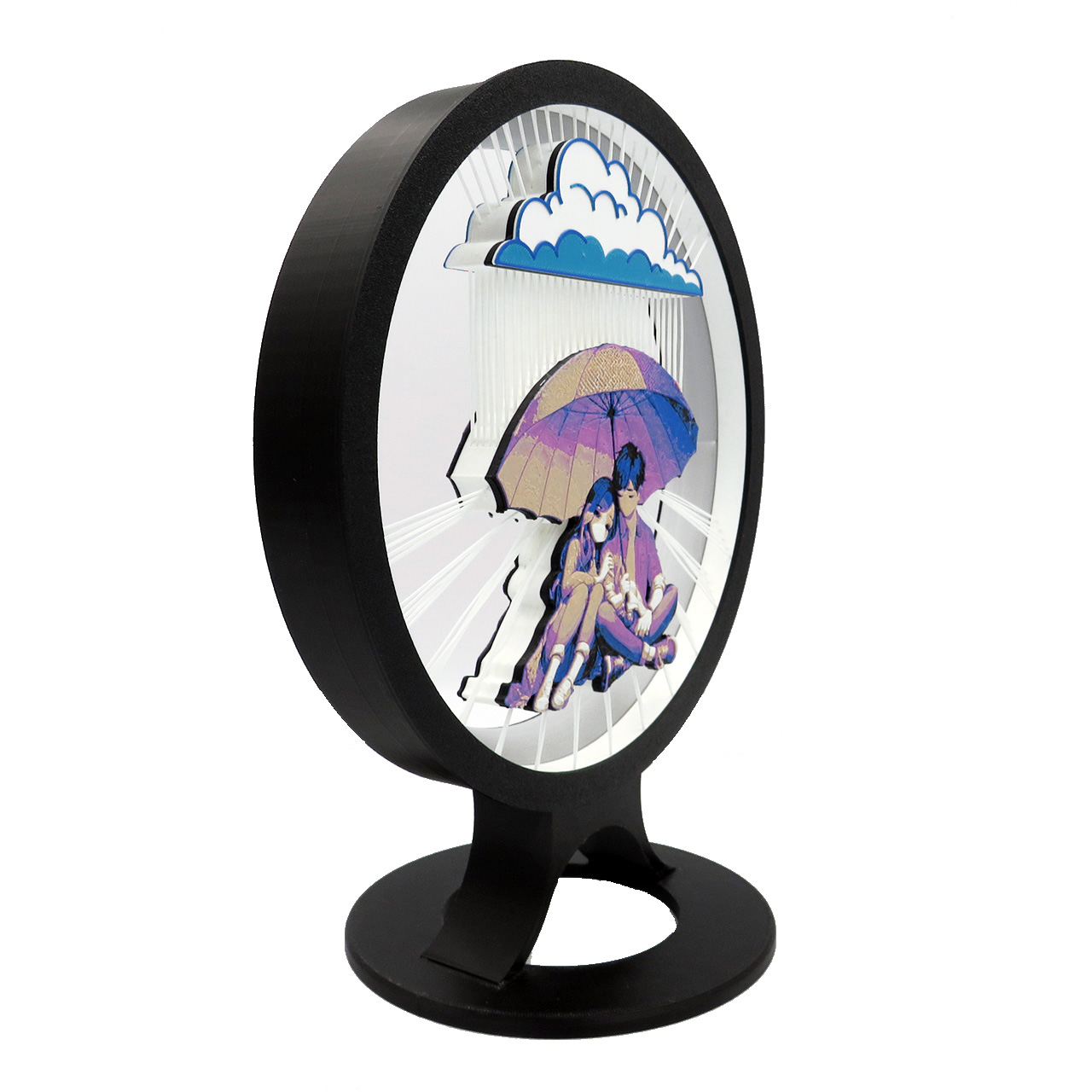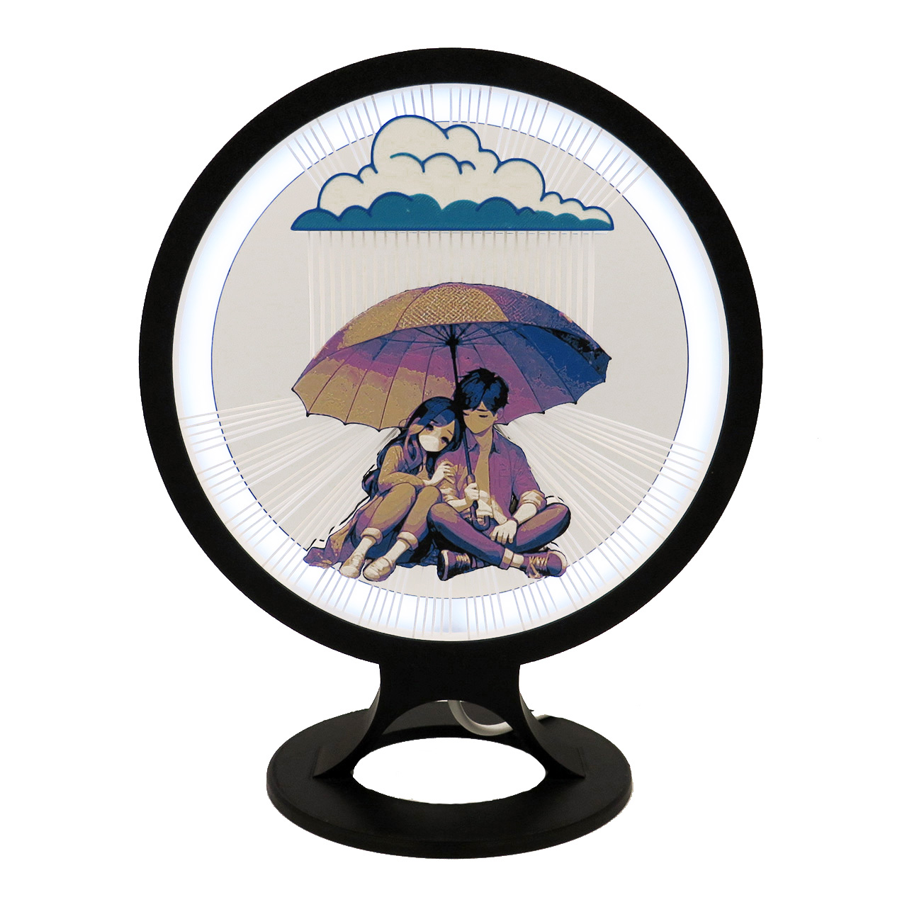 Stalinis šviestuvas pora sėdinti po lyjančiu debesėliu, LED, pastatomas su keičiamomis dekoracijomis. Šis apskritimo formos šviestuvas su LED juosta turi spalvotą piešinį sukurtą iš kelių plastiko spalvų – porą su lietsargiu sėdinčią po lyjančiu debesėliu, kuris tarsi sklendžia ore palaikomas plastiko gijų (dekoracijoje iš viso yra 235 plastiko gijų, o 1 gijos storis yra mažesnis nei 1mm). Piešinys yra abiejose pusėse, todėl šį šviestuvą galima naudoti iš dviejų pusių. Šis šviestuvas yra naktinis ir skaitymui netinka.