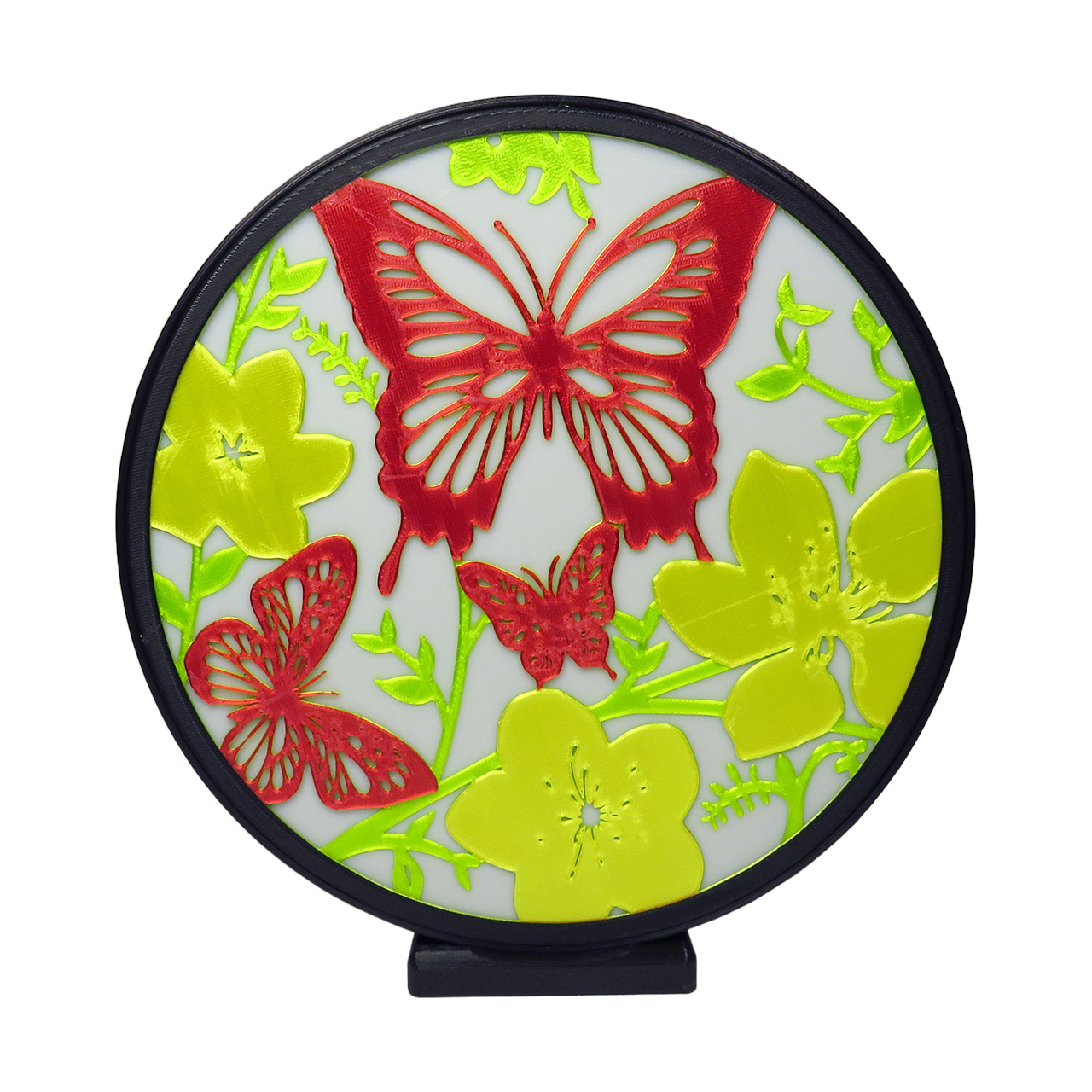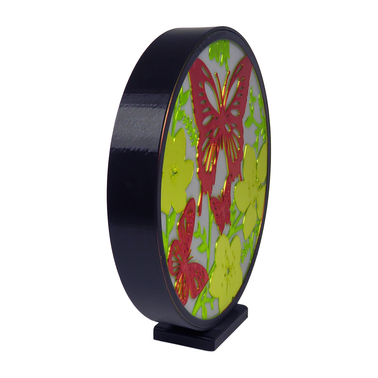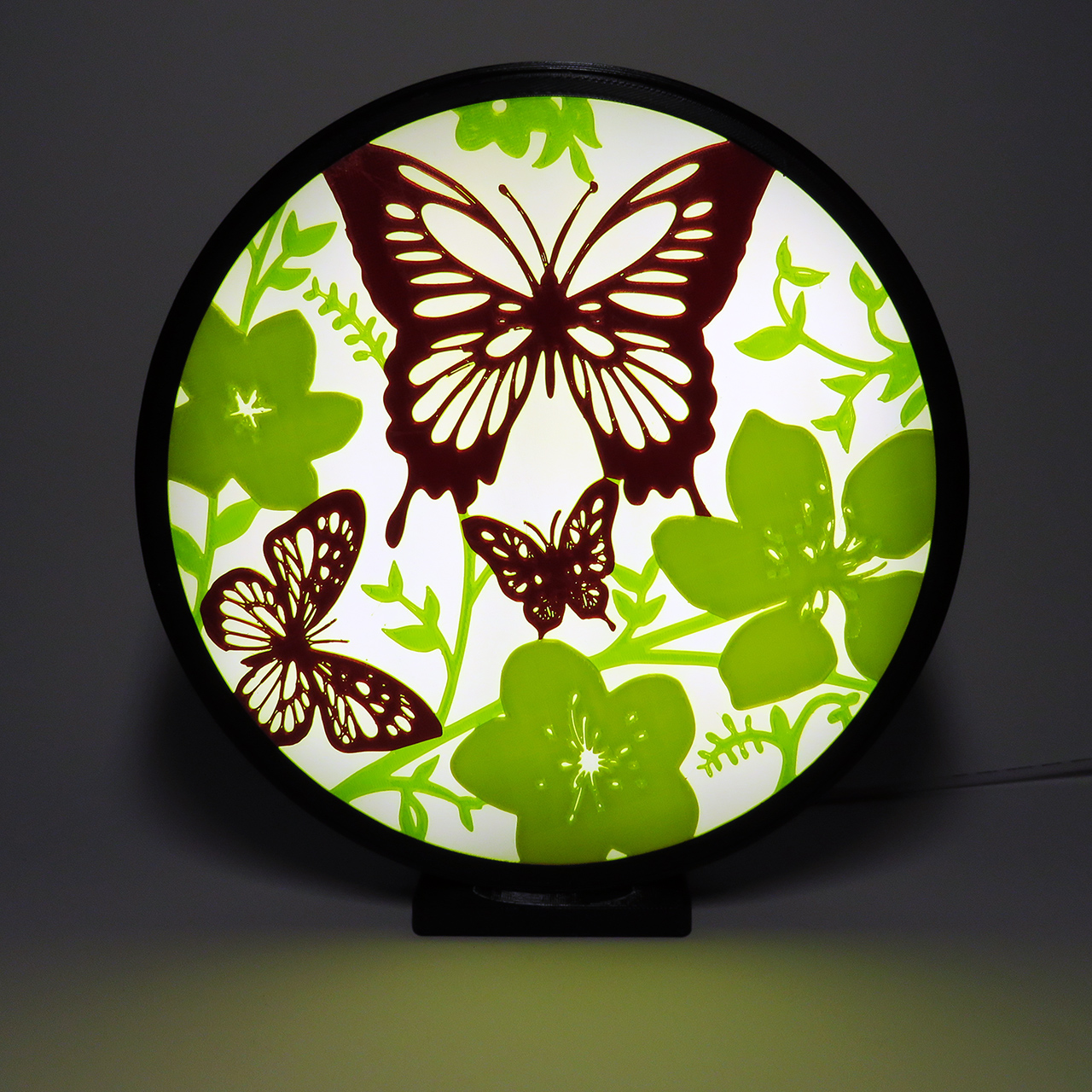 Stalinis naktinis 3D šviestuvas gėlės ir drugeliai, LED, pastatomas. Šis apskritimo formos šviestuvas turi kelių skirtingų spalvų piešinį, šviečia tik į vieną pusę, yra naktinis ir skaitymui netinka.