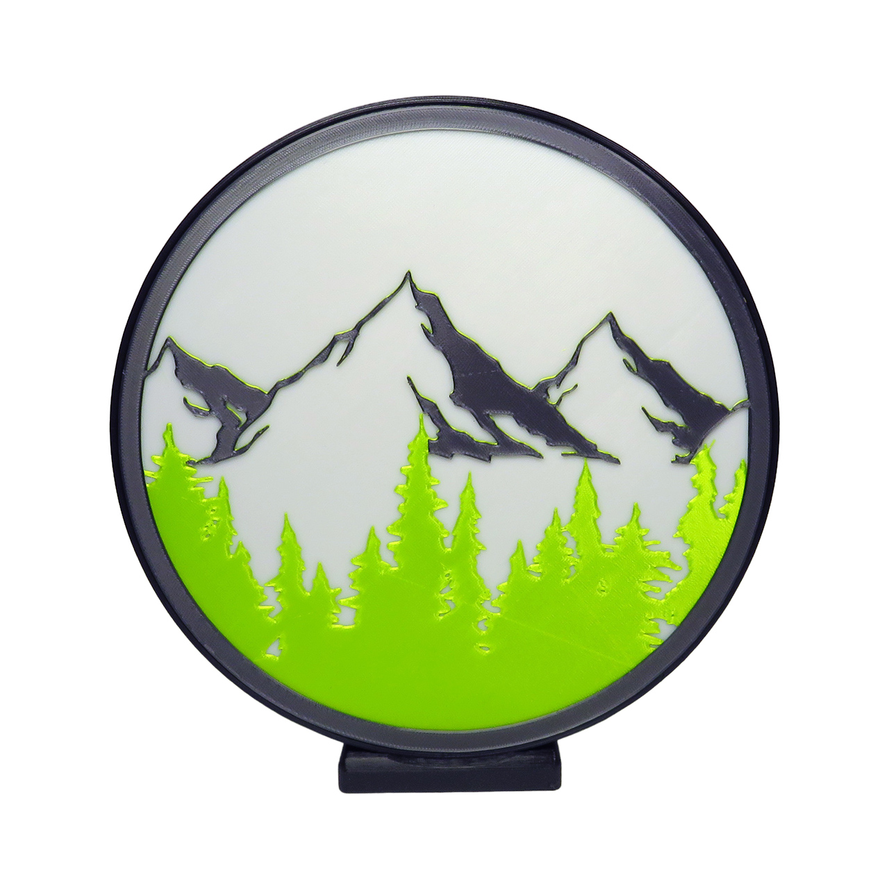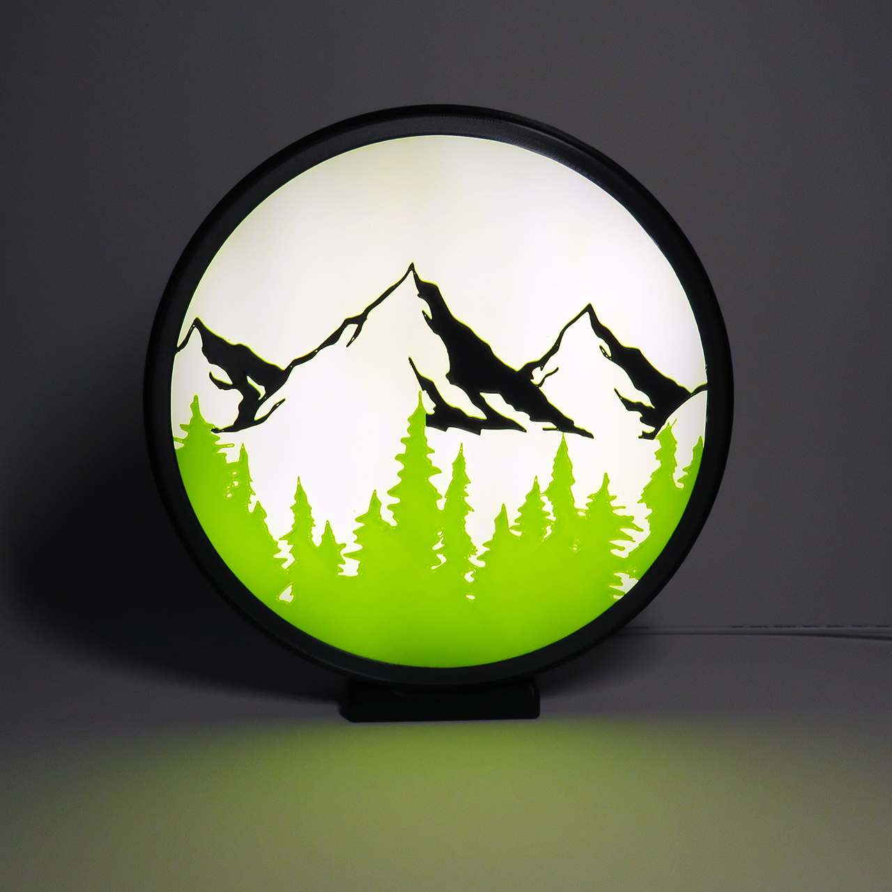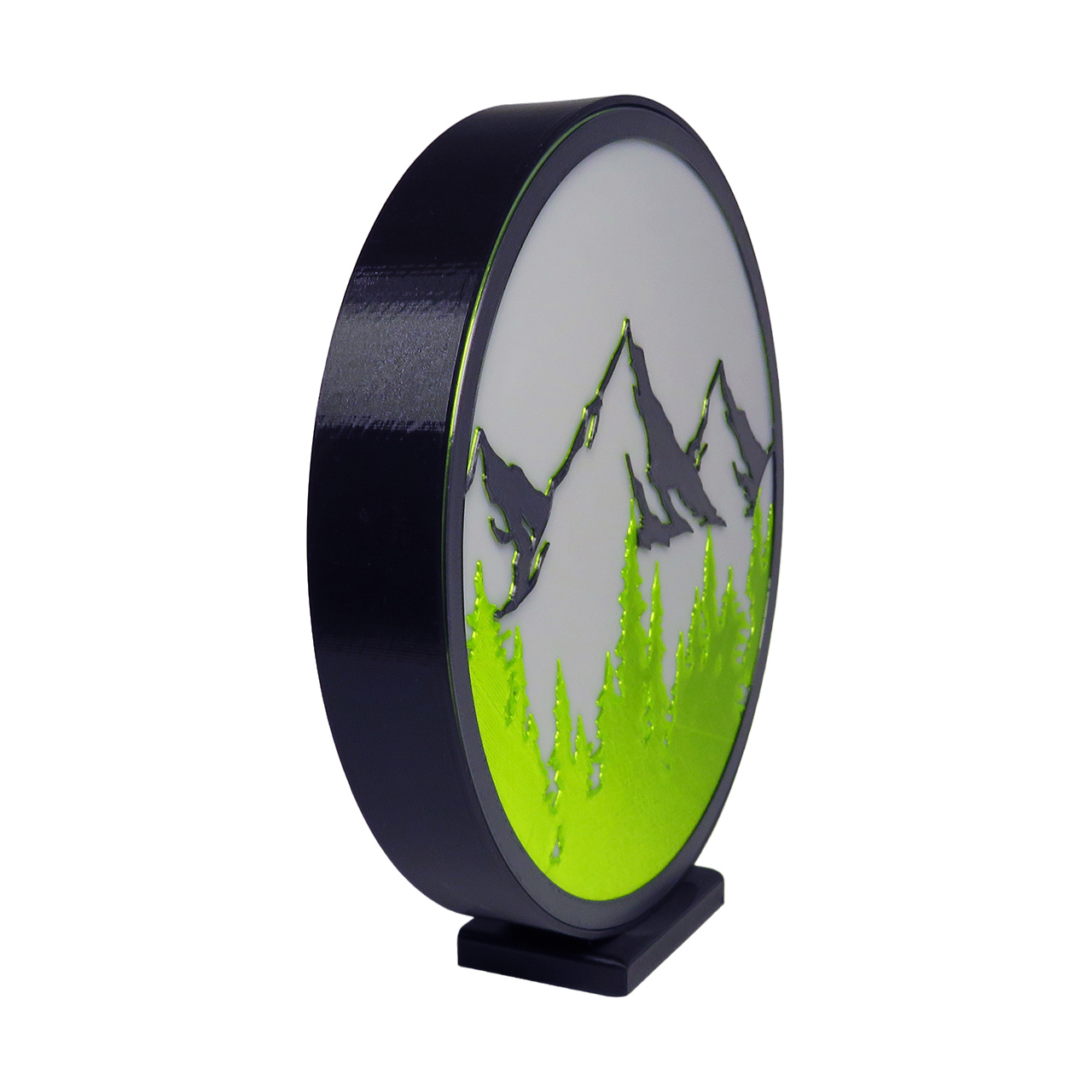 Stalinis naktinis 3D šviestuvas kalnai ir miškas, LED, pastatomas. Šis apskritimo formos šviestuvas turi kelių skirtingų spalvų piešinį, šviečia tik į vieną pusę, yra naktinis ir skaitymui netinka.