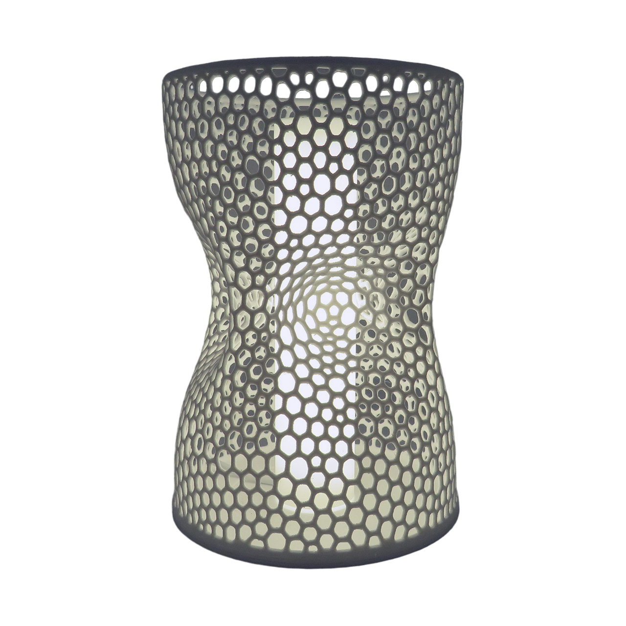 Stalinis naktinis 3D šviestuvas Modern su ertmėmis, LED, pastatomas. Šis elegantiškas šviestuvas yra ne vientisas o su ertmėmis, per kurias sklinda šviesa. Šis šviestuvas yra naktinis ir skaitymui netinka.