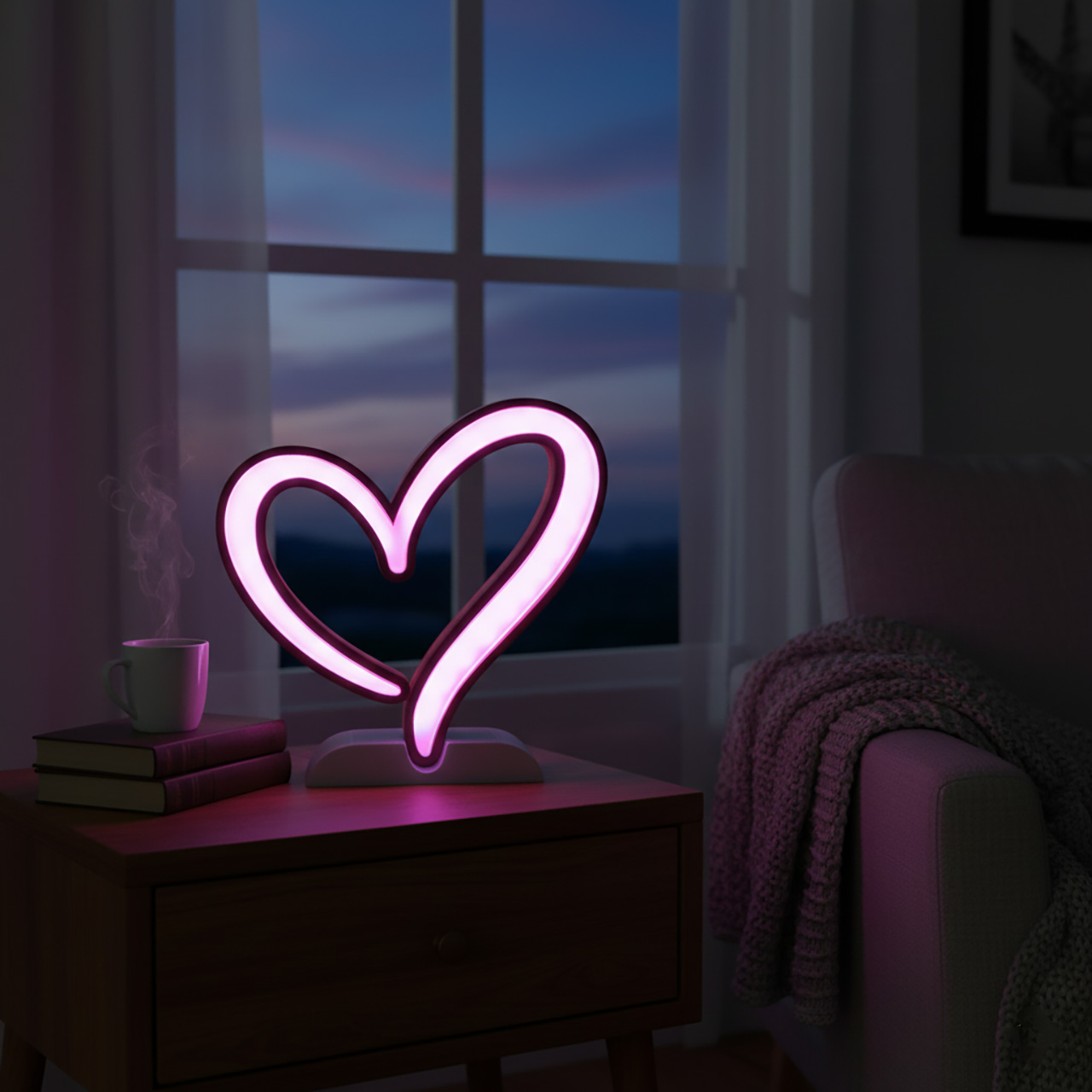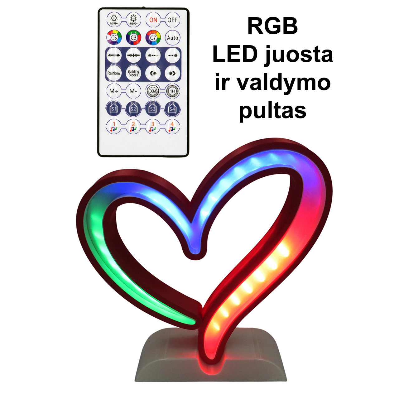Stalinis naktinis 3D šviestuvas Širdelė, su spalvota RGB LED juosta, pastatomas. Šis šviestuvas yra širdelės-širdies formos, šviečia tik į vieną pusę, yra naktinis ir skaitymui netinka.