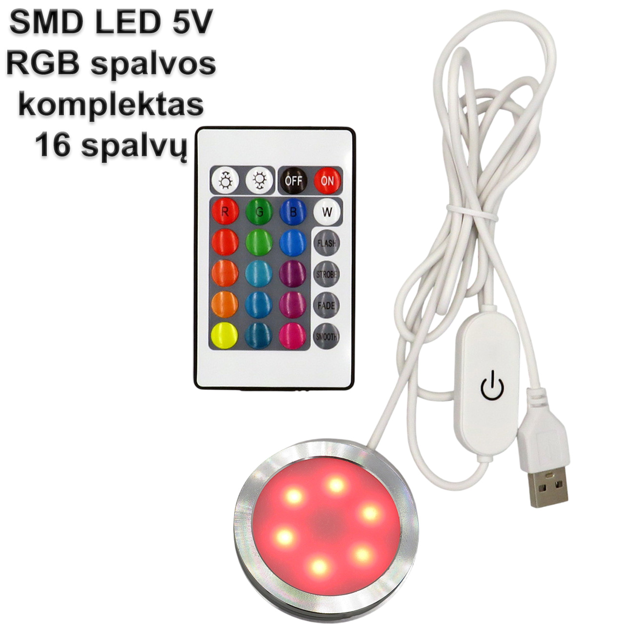 2. Spalvotos RGB LED juostos kiekviena lemputė gali šviesti kita spalva nei šalia esanti, tai reiškia kad šviestuvas vienu metu gali šviesti daugeliu skirtingų spalvų, o jungiklis gali išjungti/įjungti šviestuvą, reguliuoti švietimo intensyvumą, turi 100 spalvų režimų, taip pat 16 muzikos režimų t.y. LED juosta gali keisti spalvas pagal muziką. Jungiklį galima valdyti distanciniu pultu ir/arba telefonu per programėlę.