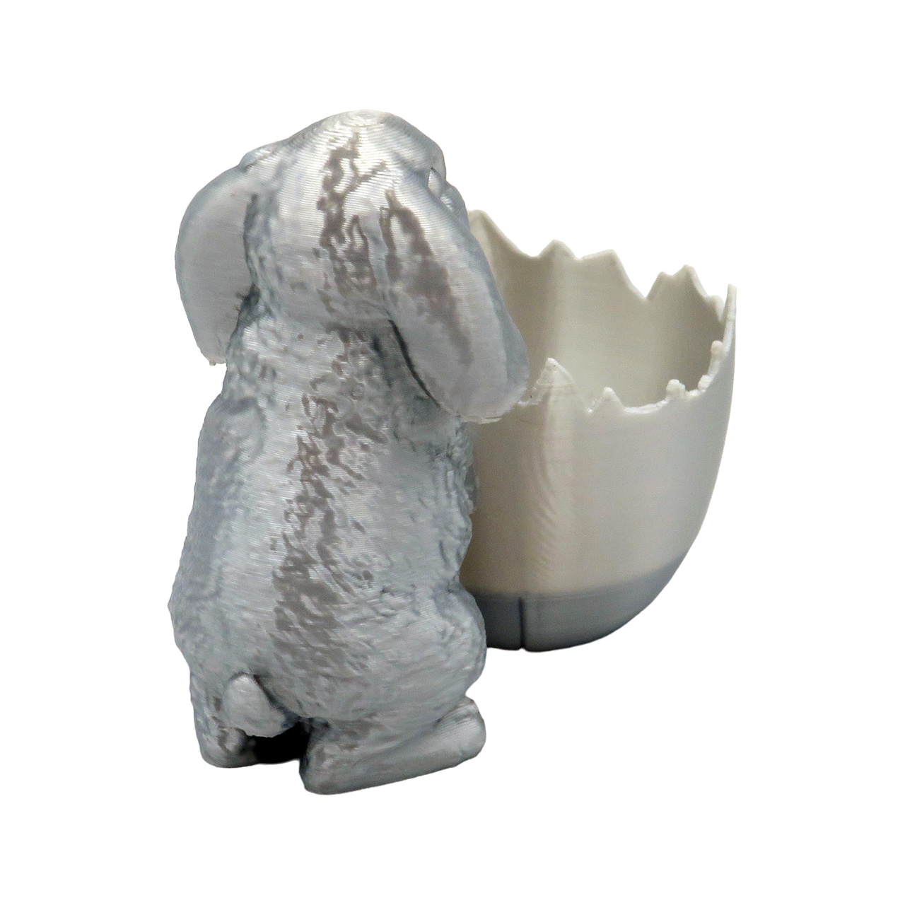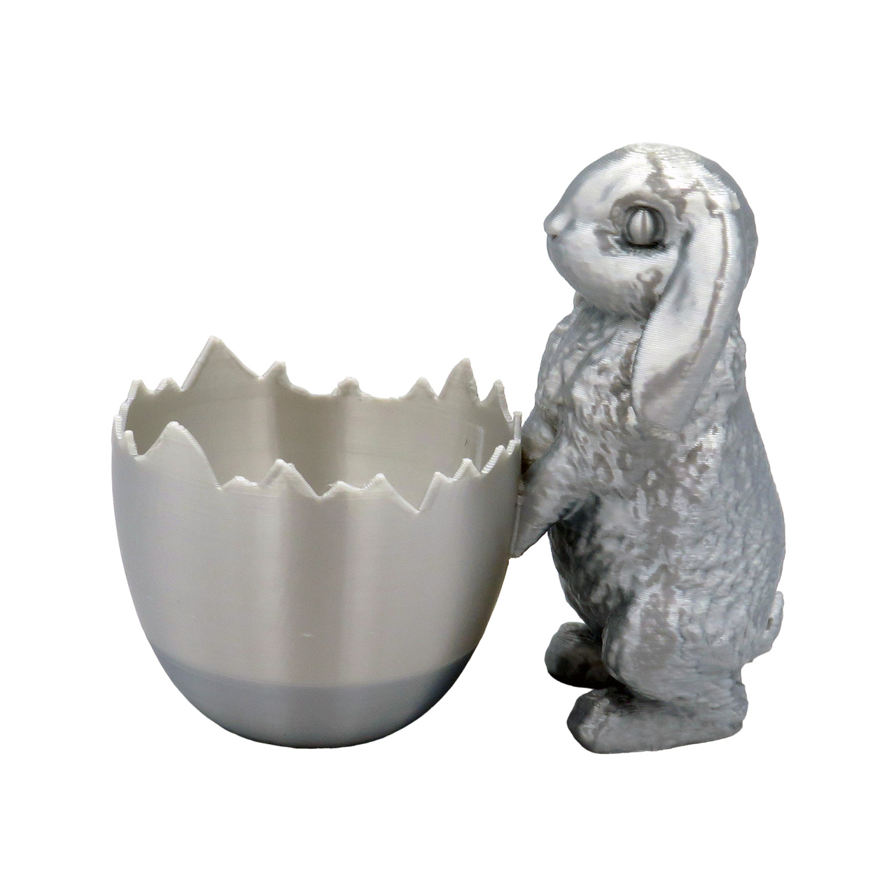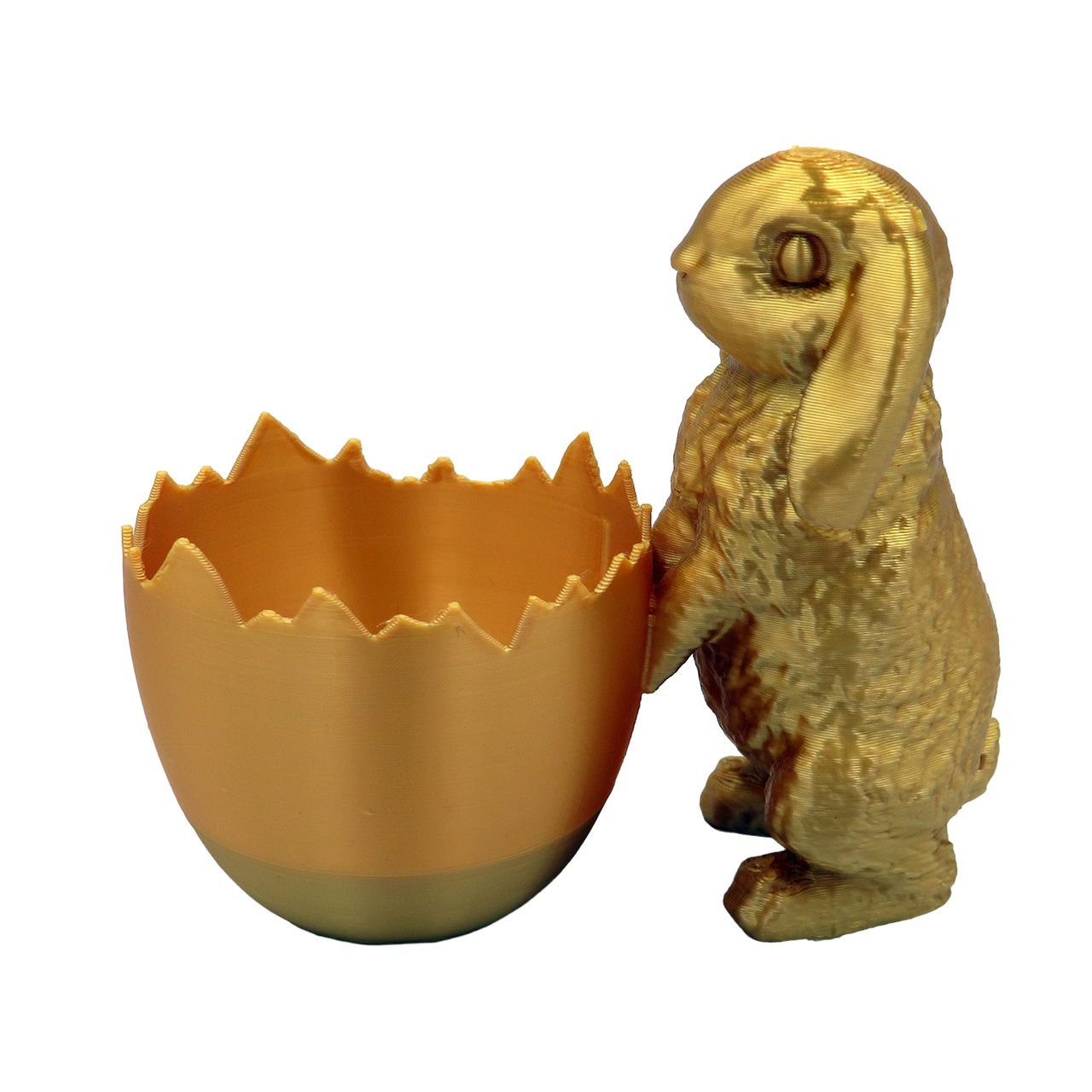 Vėlykinis margučio laikiklis Kiškis. Dekoracija kiškis laikantis suskilusį kiaušinį, į kurį galima įdėti dekoratyvinį arba tikrą kiaušinį, tinka tiek kaip vėlykinė dekoracija, tiek kaip namų dekoro detalė. Nuotraukose pavaizduotas PLA metalo blizgesio plastiku aukso ir sidabro spalvomis atspausdintas kiškis, tačiau jūs galite rinktis ir iš kito plastiko rūšies ir spalvos. Plastikų spalvų pavyzdžiai yra: https://3dgaminiai.lt/plastikai/plastiko-spalvos/