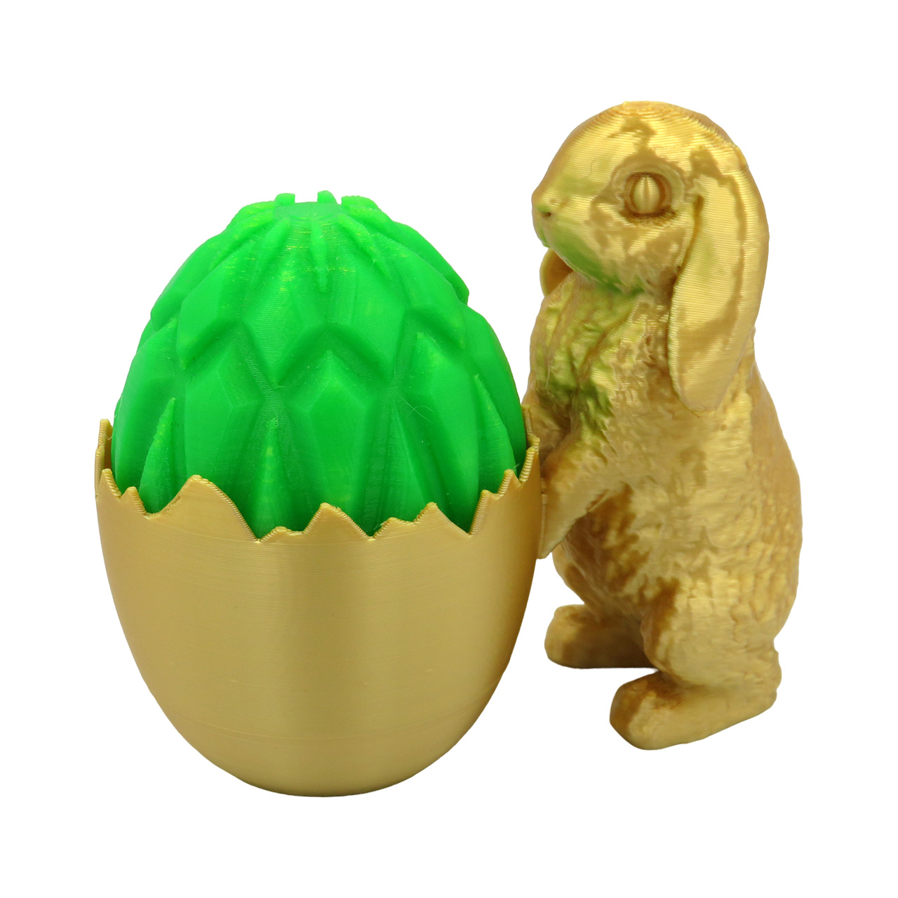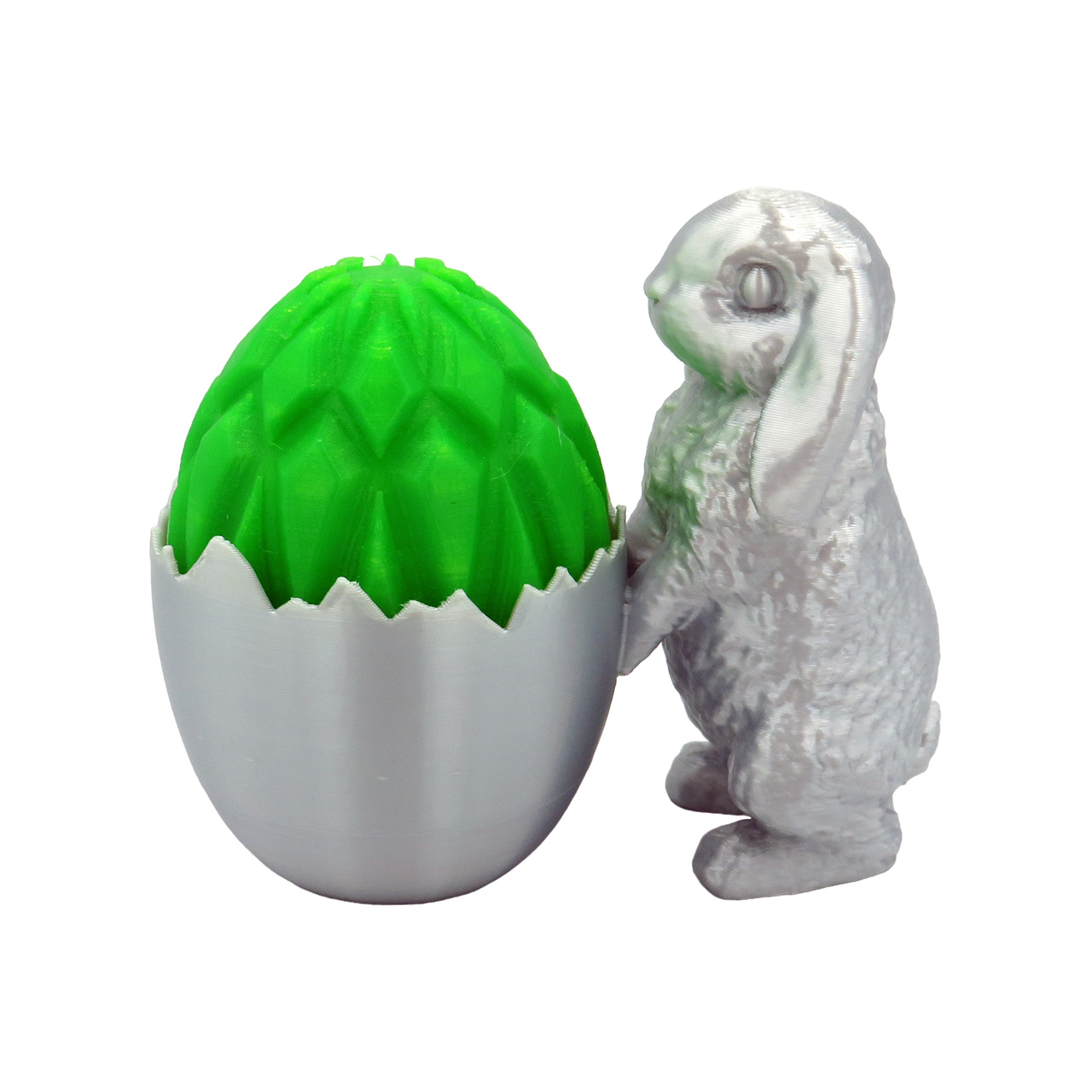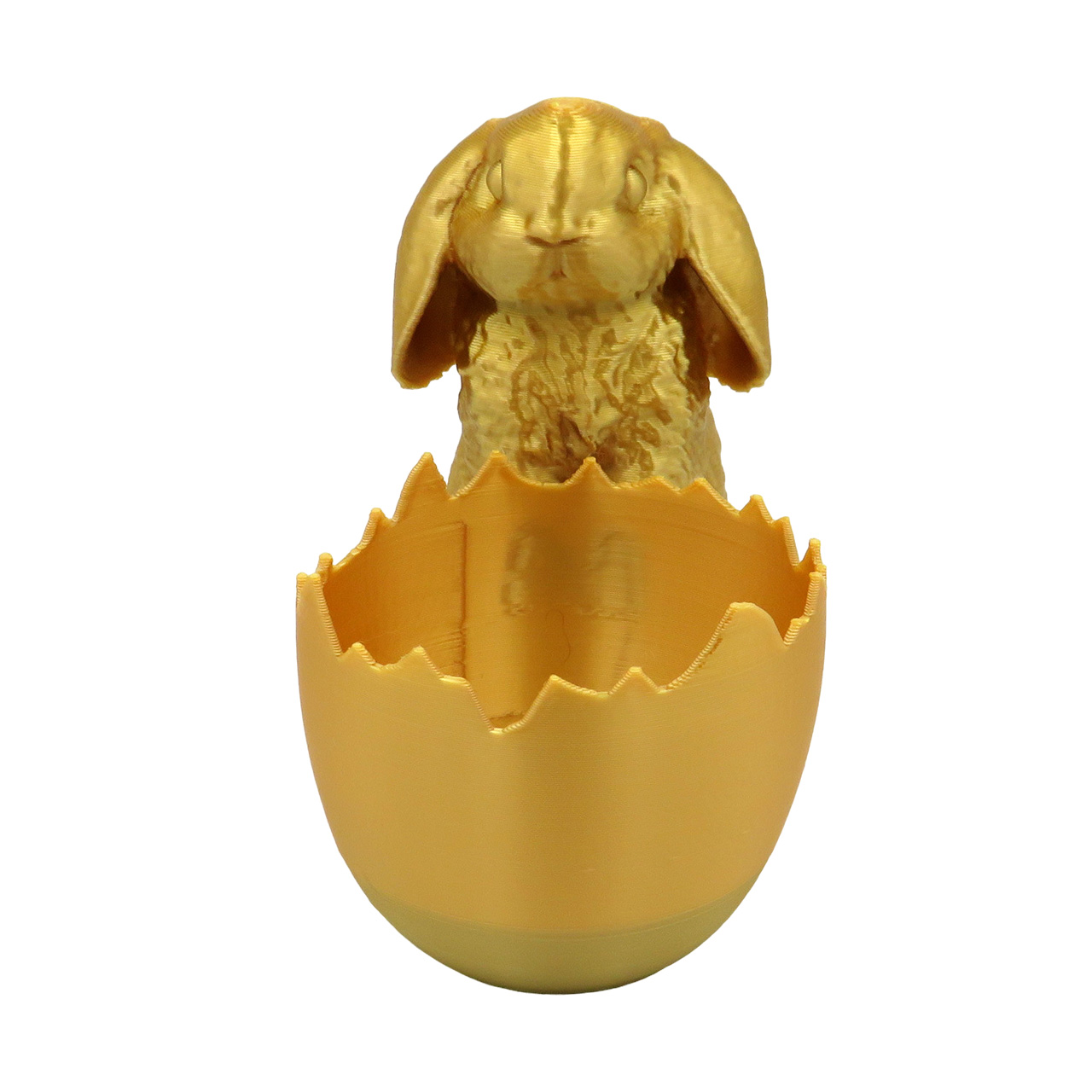 Vėlykinis margučio laikiklis Kiškis. Dekoracija kiškis laikantis suskilusį kiaušinį, į kurį galima įdėti dekoratyvinį arba tikrą kiaušinį, tinka tiek kaip vėlykinė dekoracija, tiek kaip namų dekoro detalė. Nuotraukose pavaizduotas PLA metalo blizgesio plastiku aukso ir sidabro spalvomis atspausdintas kiškis, tačiau jūs galite rinktis ir iš kito plastiko rūšies ir spalvos. Plastikų spalvų pavyzdžiai yra: https://3dgaminiai.lt/plastikai/plastiko-spalvos/